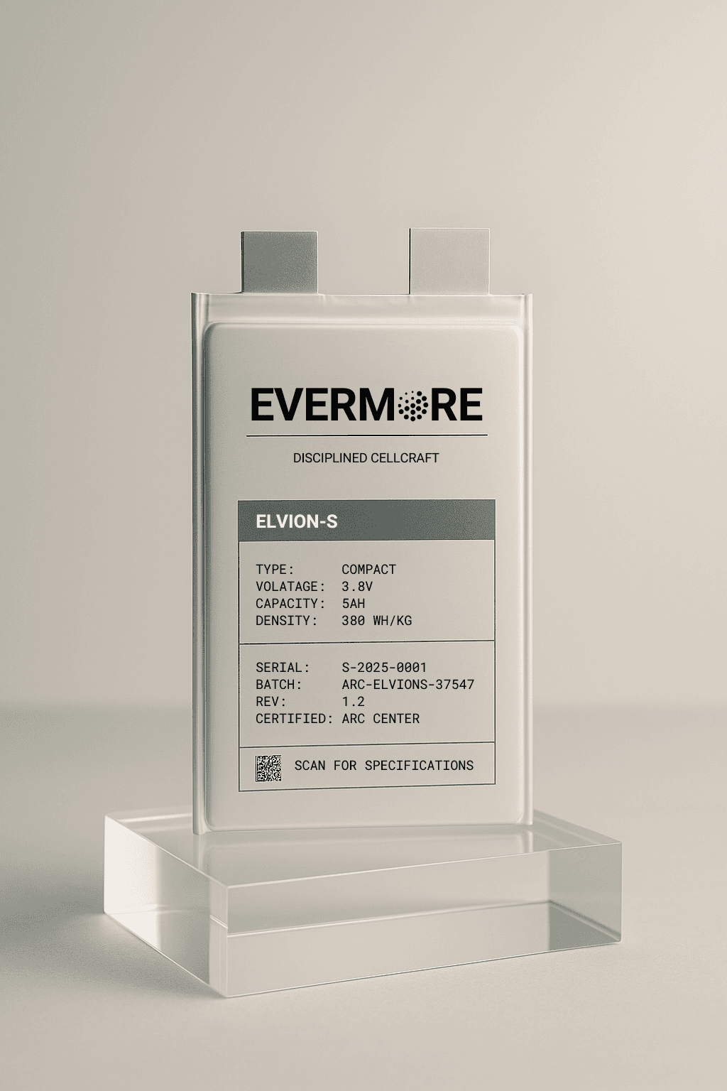 ELVION-S represents Evermore’s compact-class semi-solid lithium cell, engineered for high-specific-energy applications where size and efficiency are critical.